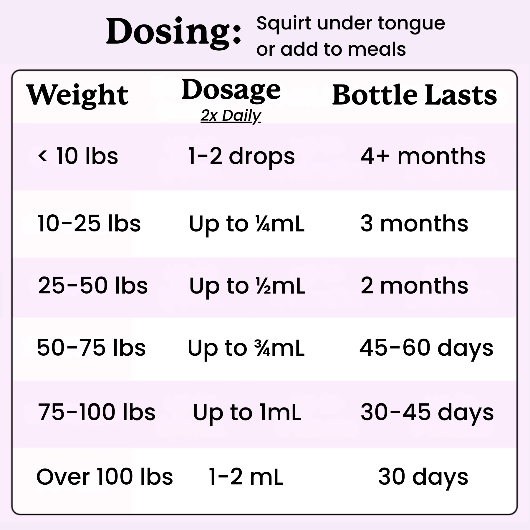 100+ lbs — 1–2 mL, twice daily
